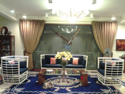 Tại phòng khách một bộ bàn ghế salong bằng mây đi kèm gối đệm trang nhã, kết hợp các loại giá để sách báo, vật dụng trang trí sẽ làm cho căn phòng trở nên ấm cũng, gần gũi nhưng cũng không kém phần sang trọng với chất liệu bằng mây còn đem lại cảm giác nhẹ nhàng êm ái cho người sử dụng.